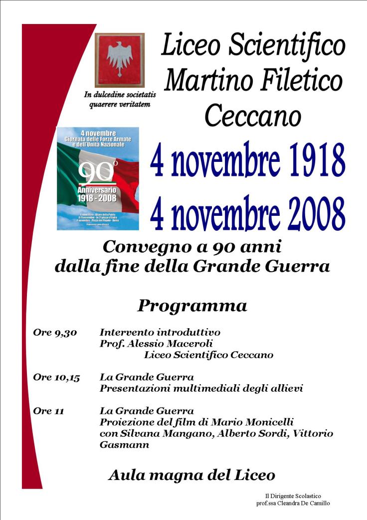 CECCANO _ Esattamente novanta anni fa, il 4 novembre 1918, aveva termine il Primo Conflitto Mondiale – La Grande Guerra – un evento che ha segnato in modo profondo e indelebile l’inizio del ‘900 e che ha determinato radicali mutamenti politici e sociali. La data, che celebra la fine vittoriosa della guerra, commemora la firma dell’armistizio siglato a Villa Giusti (Padova) con l’Impero austro-ungarico ed è divenuta la giornata dedicata alle Forze Armate. Gli insegnanti di storia del Liceo hanno ritenuto opportuno organizzare, proprio per il 4 novembre 2008, un convegno che, oltre a richiamare l’evento di 90 anni fa, offra ai giovani spunti di riflessione sulla situazione attuale. In questa giornata, che la Repubblica dedica alle Forze Armate, si intende ricordare, in special modo, tutti coloro che, anche giovanissimi, hanno sacrificato il bene supremo della vita per un’ideale di Patria e di attaccamento al dovere: valori immutati nel tempo, per i militari di allora e quelli di oggi e si intende, altresì, sottolineare il legame che unisce la Nazione alle sue Forze Armate e, nel contempo, rinsaldare la memoria e offrire un commosso ricordo alle generazioni che hanno servito le armi in Patria. Nel contempo, il Convegno ha l’intenzione di fornire ai giovani elementi di riflessione critica su quanto accadde 90 anni fa. il convegno prevede una introduzione da parte del prof. Alessio Maceroli, quindi la presentazione di alcuni materiali multimediali preparati dagli studenti e la visione del film La grande guerra di Mario Monicelli. Il Convegno avrà inizio alle ore 9,30
