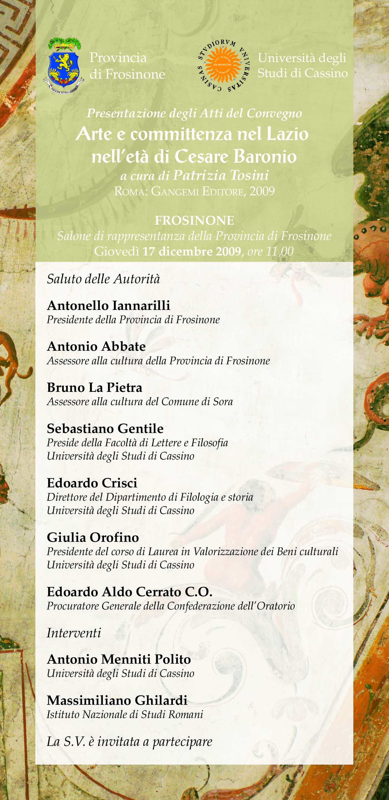 Il ruolo del card. cesare Baronio nella committenza artistica del ‘600: è il tema della presentazione di un libro che avrà luogo giovedì 17 dicembre, presso il salone dell’Amministrazione Provinciale a Frosinone, con inizio alle ore 11.