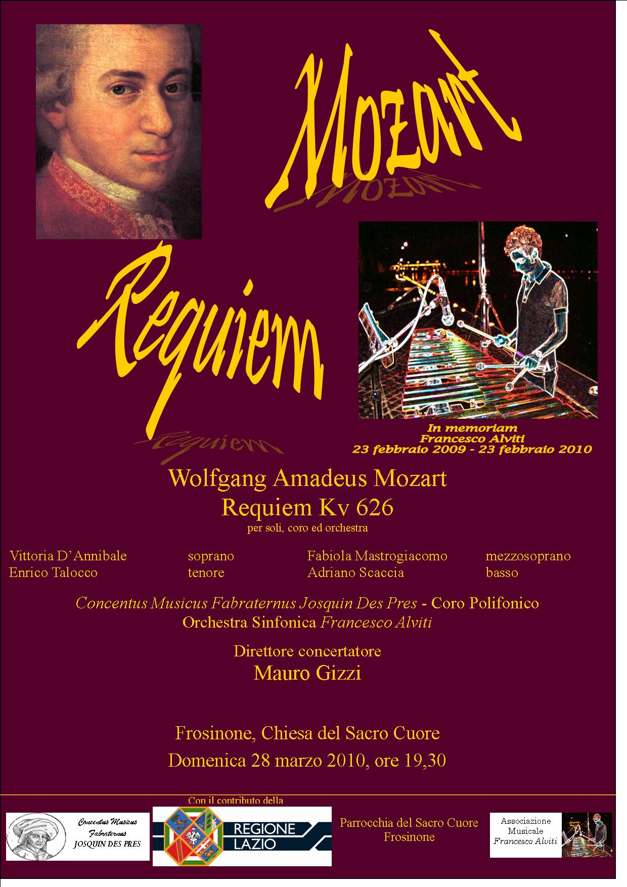 Il Requiem di Mozart a Frosinone, in memoria dei musicisti scomparsi, Pio Di Meo, Daniele Paris, Francesco Alviti. Il concerto ci sarà la Domenica delle Palme 28 marzo, alle ore 19,30, nella Chiesa del Sacro Cuore, e sarà eseguito dal soprano Vittoria d’Annibale, dal mezzosoprano Fabiola Mastrogiacomo, dal tenore Enrico Talocco e dal basso Adriano Scaccia. Saranno accompagnati dall’Orchestra Sinfonica Francesco Alviti, al debutto per questa occasione e costituita da giovani musicisti che hanno studiato al Conservatorio Licinio Refice di Frosinone. Il coro è quello del Concentus Musicus Fabraternus Josquin des Pres e la direzione è affidata a Mauro Gizzi. Il grande compositore salisburghese compose il Requiem mentre stava per morire, tanto da lasciarlo incompiuto. La sua è dunque una meditazione sul mistero della propria vita e sulla lotta tra la morte e Gesù che la vince, risorgendo. Le note struggenti e piene di speranza del Requiem risuoneranno dunque nell chiesa frusinate proprio nel giorno in cui si ricorda l’ingresso di Gesù in Gerusalemme e l’inizio della settimana di Passione. : Questa edizione del Requiem mozartiano è già stata eseguita a Sora, Ceccano, Colleferro, San Giovanni Rotondo e verrà ancora rpesentato a Roma, nella basilica dell’Ara Coeli, martedì 6 aprile, in ricordo anniversario del terremoto dell’Aquila.