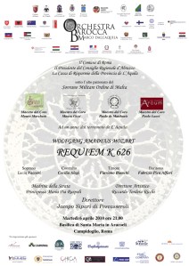 La musica ricorderà le vittime e servirà a dare nuova forza all’opera di ricostruzione. L’iniziativa è stata presa dal Comune di Roma, dal Presidente del Consiglio Regionale d’Abruzzo e dalla Cassa di Risparmio della provincia dell’Aquila, sotto l’alto patronato del Sovrano Militare Ordine di Malta , dell’Ambasciata dell’Impero del Giappone e della Repubblica Federale di Germania. Ad eseguire il Requiem del grande compositore austriaco, nella stupenda chiesa dell’Ara Coeli al Campidoglio, sarà appunto il Coro del Concentus Musicus fabraternus Josquin Des Pres, insieme al Coro dell’Arcum di Roma, alla Cappella Musicale Costantina e al Coro Città di Roma, accompagnati dall’Orchestra Barocca Marco Dall’Aquila, voci soliste Lucia Vaccari, Cecilia Alegi, Flaviano Bianchi, Fabrizio Pica Alfieri. La direzione è affidata a Jacopo Sipari di Pescasseroli, mentre la direzione artistica dell’evento è curata da Riccardo Tordera Ricchi.