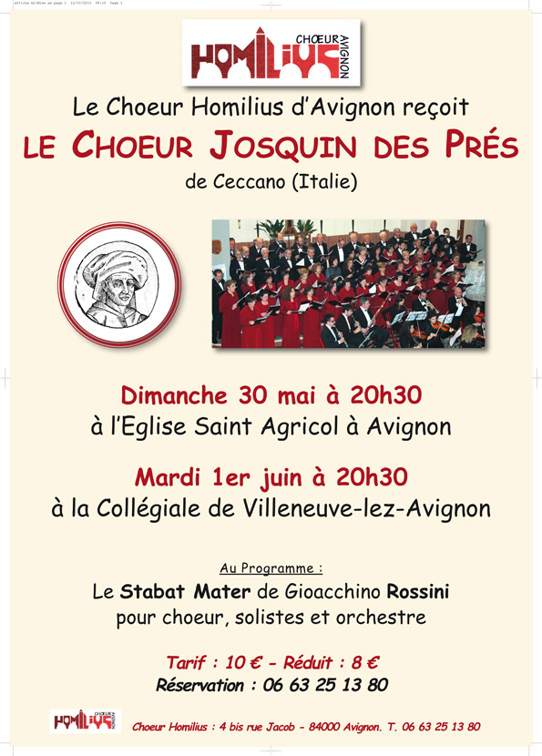 C’è attesa ad Avignone per i due concerti che il Concentus Musicus Fabraternus Josquin Des Pres, diretto da Mauro Gizzi, terrà nella città dei Papi. Il primo appuntamento è previsto nella bella chiesa gotica di Saint Agricol, vicino a Place de l’Horloge, domenica 31 maggio, alle ore 20,30. Il secondo è invece il 1° giugno, a Villeneuve lez Avignon, nella Collegiale, alle 20,30. Il programma del concerto prevede l’esecuzione dello Stabat Mater di Giacchino Rossini per soli, coro ed orchestra. Si tratta di una delle più importanti composizioni della musica sacra e capolavoro rossiniano, scritto poco prima di morire. Le voci saranno quelle del soprano Vittoria D’Annibale, del mezzosoprano Fabiola Mastrogiacomo, del tenore Giuseppe Ruggiero e del basso Mario Mastroianni, accompagnati dall’ensemble cameristico Francesco Alviti, composto da flauto Paola Frosina, fagotto Melissa Del Brocco, oboe Maria Carmen Di Mario, clarinetti Selena Malizia, Silvia Dutto, timpani Giampiero Carlini, organo Alessandra Maura e pianoforte Silvia Palombo. Il coro è naturalmente quello del Concentus Musicus Fabraternus Josquin Des Pres e la direzione è affidata a Mauro Gizzi.