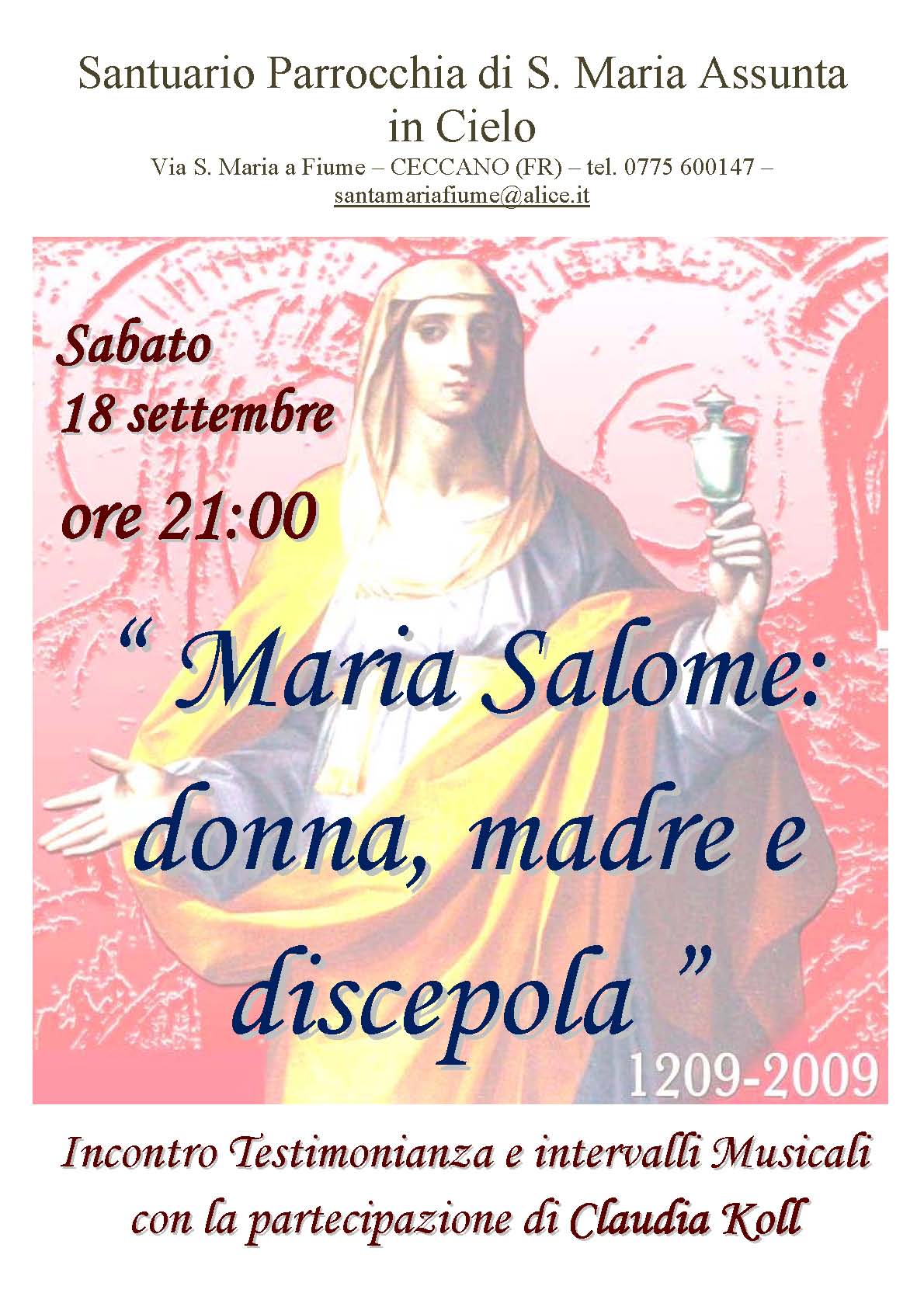 Sabato 18 settembre, alle 21, racconterà la sua storia nella chiesa di Santa Maria a fiume, in Ceccano, in occasione della sosta presso questa parrocchia delle reliquie di S. Maria Salome, madre degli apostoli Giacomo e Giovanni, una delle donne ad essere rimasta sotto la croce senza abbandonare Gesù, e una delle prime annunciatrici della resurrezione.