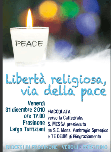 Frosinone_ Fiaccole per la pace e solidarietà per chi è solo, un modo diverso di vivere l’ultimo giorno dell’anno: alle 17 del 31 dicembre, quando tutti sono affannati a preparare cenoni e alla ricerca disperata di divertimento, i cristiani e gli uomini di buona volontà testimonieranno il loro impegno per la pace con una fiaccolata che da Largo Turriziani arriverà fino alla Cattedrale, dove il vescovo, mons. Ambrogio Spreafico, celebrerà il Te Deum di ringraziamento e consegnerà alle autorità presenti il messaggio di Benedetto XVI per la XLIV Giornata Mondiale della Pace, sul tema: Libertà religiosa, via della pace. Si tratta di una questione molto importante: il XX secolo ha visto oltre un milione di cristiani morire per la loro fede, e accanto a loro tanti altri uomini di altre religioni che hanno testimoniato a caro prezzo la loro fede.
