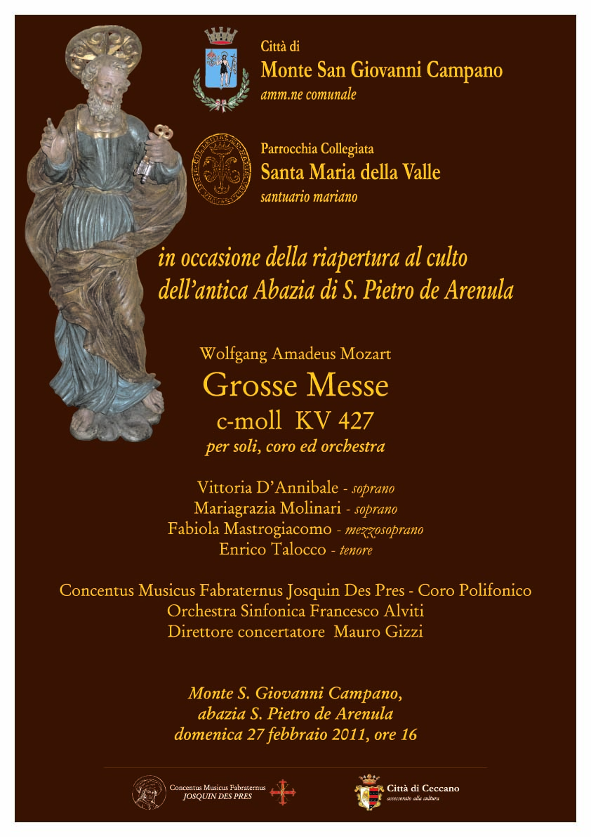 Saranno le note solenni della Grande Messa di Mozart a concludere domenica 27 febbraio alle ore 16 le manifestazioni per la riapertura al culto della Chiesa di San Pietro de Arenula in Monte San Giovanni Campano.
