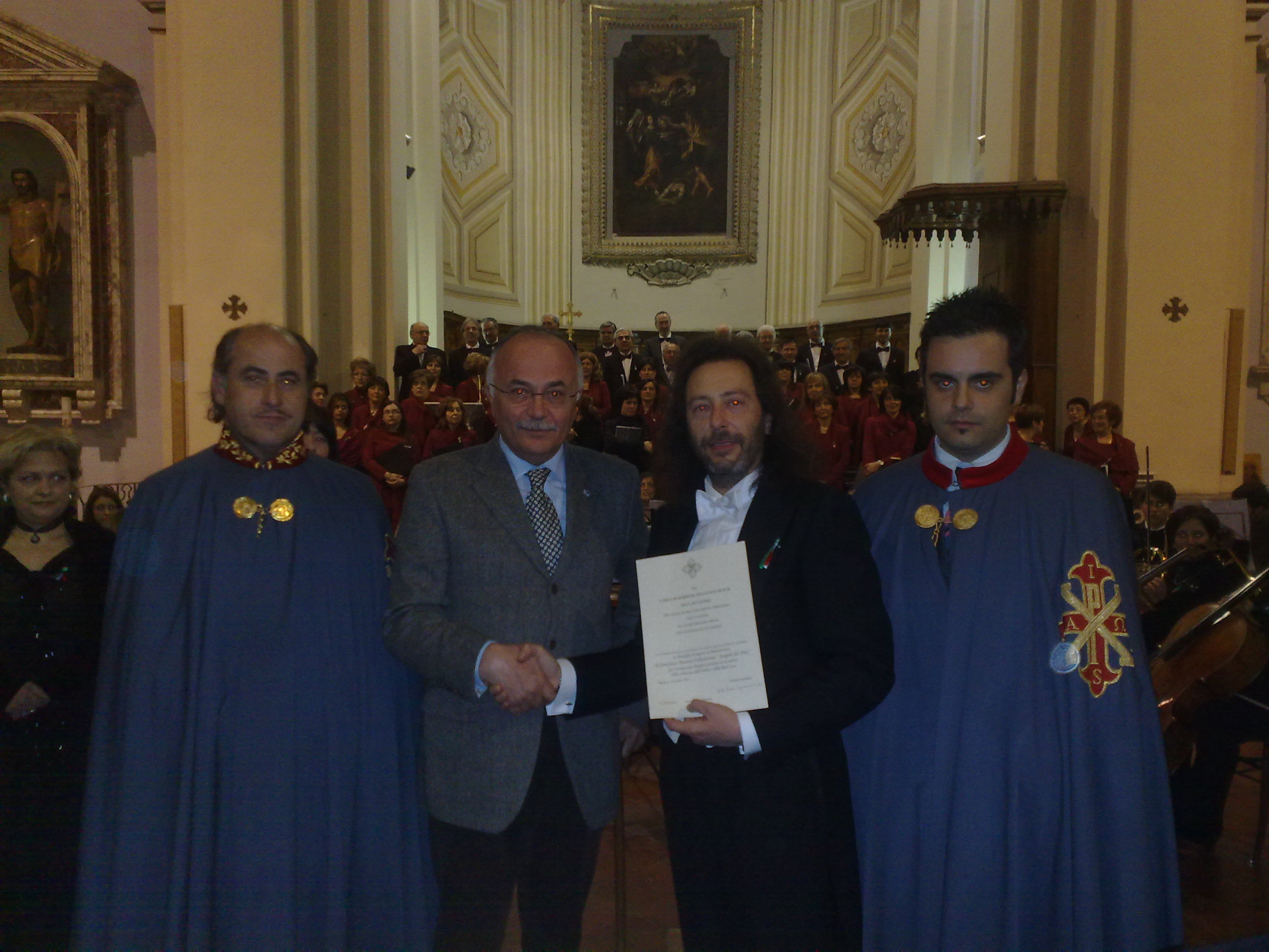 Apprezzamento ed applausi che sono stati poi coronati dalla consegna al Concentus della Medaglia d’Argento di Benemerenza da parte di S.A.R. Carlo di Borbone, per quanto il Coro diretto da Mauro Gizzi ha fatto per il Sacro Ordine Militare Costantiniano di S. Giorgio, ordine dinastico dei Sovrani delle Due Sicilie. E’ stato l’avv. Franco Ciufo, della delegazione del Lazio, a consegnare la medaglia a nome di Carlo di Borbone, ricordando anche la funzione contenporanea dell’ordine di San Giorgio.