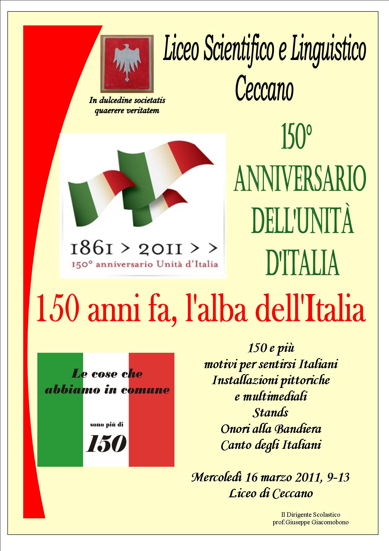 Il 12 marzo, le classi musicali del Liceo hanno presentato Il flauto magico di Mozart, espressione alta e solenne del riscatto dei popoli nei confronti dell’oppressore. Il 16 marzo, vigilia dell’inizio delle man…ifestazioni celebrative, il coro e l’orchestra del Liceo renderanno gli onori alla bandiera, mentre le classi IV, nei cui programmi c’è appunto lo studio del Risorgimento, allestiranno stands celebrativi, guidati dagli insegnanti di storia. Le classi IV dedicheranno il loro viaggio di studio alle capitali del regno (Firenze e Torino) dal 29 marzo al 2 aprile, in occasione della riapertura del Museo nazionale del Risorgimento a Palazzo Carignano a Torino, il 17 marzo 2011.