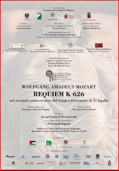 Il Coro Josquin Des Pres diretto da Mauro Gizzi canterà mercoledì 6 aprile, alle ore 21, nella Basilica dell’Ara Coeli in Campidoglio di Roma nel Requiem di Mozart dedicato a L’Aquila, nel II anniversario del terremoto. La musica ricorderà le vittime e servirà a dare nuova forza all’opera di ricostruzione. L’iniziativa è stata presa dal Comune di Roma, dal Presidente del Consiglio Regionale d’Abruzzo e dalla Cassa di Risparmio della provincia dell’Aquila, sotto l’alto patronato del Sovrano Militare Ordine di Malta , dell’Ambasciata d’Austria e di quella del regno di Giordania, con il coordinamento degli Ordini Dinastici della Real casa di Savoia. Ad eseguire il Requiem del grande compositore austriaco, nella stupenda chiesa dell’Ara Coeli al Campidoglio, sarà appunto il Coro del Concentus Musicus Fabraternus Josquin Des Pres, insieme al Coro dell’Arcum di Roma, alla Cappella Musicale Costantina e al Coro Città di Roma, accompagnati dall’Orchestra Barocca Marco Dall’Aquila, voci soliste Lucia Vaccari, Federica Carnevale, Vincenzo di Betta, Nejat Isik Belen. La direzione è affidata a Jacopo Sipari di Pescasseroli, mentre la direzione artistica dell’evento è curata da Riccardo Tordera