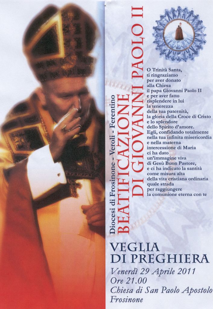 Una veglia di preghiera presieduta dal Vescovo Spreafico, ma anche una mostra, un concerto di musica sacra e un bollo commemorativo: la Diocesi di Frosinone – Veroli – Ferentino si prepara così a commemorare la Beatificazione di Giovanni Paolo II. Venerdì 29 aprile l’intera comunità diocesana si ritroverà con Mons. Spreafico per una Veglia di preghiera organizzata nella chiesa di San Paolo Apostolo a Frosinone (zona Cavoni) che, il 16 settembre 2001, ospitò la storica visita del Pontefice (video disponibile sul sito internet www.diocesifrosinone.com – sezione Massmedia). Sarà presente uno stand di Poste Italiane per l’emissione di un apposito bollo commemorativo dell’evento: emissione che proseguirà anche domani a Ferentino (in concomitanza con i festeggiamenti per sant’Ambrogio m., patrono della Diocesi) e a M. S. G. Campano (in occasione della festa della Madonna del Suffragio). Da sabato 30 aprile a lunedì 2 maggio, poi, la mostra “Il tesoro della Concattedrale. Argenti e tessuti dal XIII al XX secolo” (nell’Episcopio di Ferentino, dalle ore 15.00 alle 19.00) vedrà esposto anche lo zucchetto che Giovanni Paolo II donò – il 31 maggio 1986 – ai sacerdoti ricevuti in Vaticano per il 350° anniversario del Seminario. Sabato 7 maggio sarà il Requiem Kv 626 di Mozart eseguito dal Concentus Musicus Fabraternus Josquin Des Pres nella chiesa di Santa Maria Maggiore a Ferentino (alle ore 21.00) a concludere la prima fase delle iniziative in onore del Papa polacco: si sta già lavorando, infatti, a celebrare in autunno il 10° anniversario