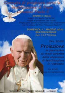 Ma anche le parrocchie non sono da meno: a Ceccano si distingue quella di S. Pietro che sabato 30 aprile alle ore 20 presenterà il film Giovanni Paolo II, mentre il giorno successivo proietterà sul grande schermo in chiesa le immagini provenienti da Piazza S. Pietro, mentre il Coro Josquin Des Pres ricorda le sue tante esperienze con Giovanni Paolo II