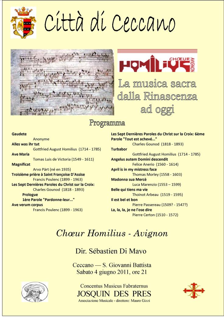 Sébastien Di Mayo, il direttore del Coro, è biologo di professione, ma la musica resta la sua più grande passione. Dopo aver conseguito il diploma di clarinettista, raggiunge nel 1996 il Coro Universitario di Avignon, in qualità di corista Basso. In seguito, ha cantato sotto la direzione di Francine Bessac, a Grenoble, prediligendo il repertorio contemporaneo (Schnittke, Pärt, Poulenc…) in piccolo Ensemble Vocal. Ha poi integrato come corista il Coro Homilius; è a questo momento che comincia ad interessarsi alla direzione vocale e ad esplorare la musica antica. Dal 2005, dirige il Coro Grimaud di l’Isle sur la Sorgue, gemellato con il Coro Polifonico di Anagni, e dal 2006 è anche il maestro del Coro Homilius di Avignon. Il coro porta il nome Homilius In omaggio a Gottfried August Homilius, compositore tedesco nato nel 1714 a Rosenthal (Saxe). Figlio di pastore protestante, studia diritto a Leipzig e partecipa alle rappresentazioni delle opere di Johann Sebastian Bach. Nel 1742 diviene organista della Frauenkirche di Dresda poi, nel 1755, cantore della Kreuzekirche e direttore musicale delle principali chiese di Dresda fino alla sua morte avvenuta nel 1785. La sua opera è considerevole e conta più di 60 mottetti, 200 cantate di chiesa, 2 oratori, 8 Magnificat, 2 raccolte di corali e numerosi pezzi per organo. Le composizioni di Homilius erano molto apprezzate e lui stesso considerato come « il migliore compositore di Musica Sacra » vivente del suo tempo. Ma la sua opera è in seguito caduta nell’oblio. Alla ricerca incessante di nuove sonorità, come lo dimostra la grandissima varietà dei suoi mottetti, Gottfried August Homilius ci invita ad ascoltare ed a scoprire la sua opera, ma anche quella dei musicisti, dimenticati o poco conosciuti, che costellano la Storia della Musica.