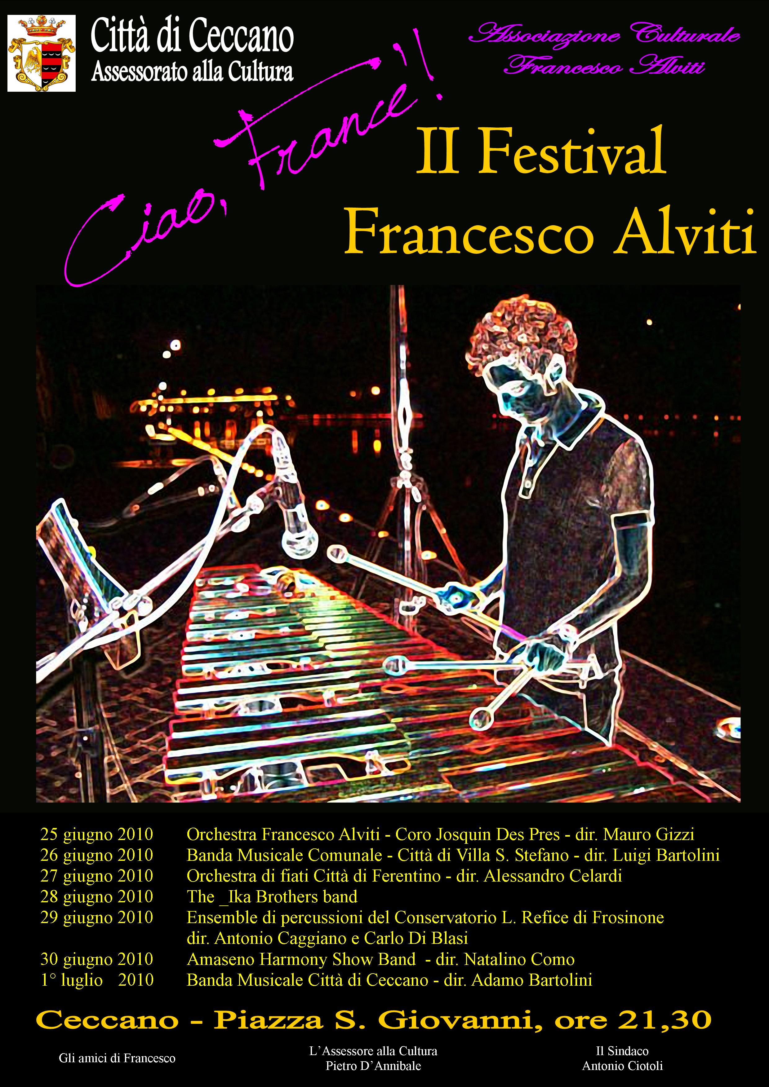 Il Festival è una vera e propria festa della musica e di quanto la musica fa per cementare l’amicizia fra i giovani: ha lo scopo di ricordare Francesco Alviti, il giovane percussionista scomparso poco più di due anni fa, dopo aver lottato coraggiosamente e tenacemente contro il suo male. I suoi amici musicisti, i tanti suoi amici con i quali aveva suonato fino a qualche giorno prima di scoprire il male che l’avrebbe portato alla morte, hanno voluto dedicargli la III edizione del Festival che porta il suo nome, a testimonianza di come la musica superi anche le barriere della morte. Così