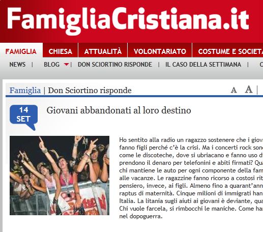 Ho sentito alla radio un ragazzo sostenere che i giovani non si sposano e non fanno figli perché c’è la crisi. Ma i concerti rock sono affollatissimi. Così come le discoteche, dove si ubriacano e fanno uso di droga. Da dove prendono il denaro per telefonini e abiti firmati? Quanto costa il motorino, e chi mantiene le auto per ogni componente della famiglia? Nessuno rinuncia alle vacanze. Le ragazzine fanno ricorso a costosi ritocchi chirurgici. Nessun pensiero, invece, ai figli. Almeno fino a quarant’anni, quando scatta il raptus di maternità. Cinque milioni di immigrati hanno trovato lavoro in Italia. La litania sugli aiuti ai giovani è deviante, quasi quanto le quote rosa. Chi vuole farcela, si rimbocchi le maniche. Come hanno fatto i nostri nonni nel dopoguerra.
