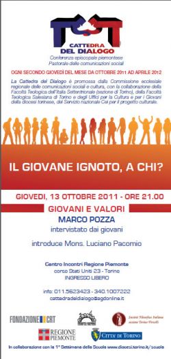 “Se c’è un umile grande scopo è quello per noi adulti di ‘conoscere’ sempre meglio con grande benevolenza e magnanimità i giovani di questa nostra generazione. E saper e poter offrire loro sempre più occasioni per presentarsi, interloquire, aver spazi per proporre e collaborare”. Con questo spirito, espresso da mons. Luciano Pacomio, delegato della Conferenza episcopale piemontese per la pastorale delle comunicazioni sociali, si apre questa sera a Torino il quarto ciclo della “Cattedra del dialogo”. Filo conduttore su cui si rifletterà fino al 12 aprile, ogni secondo giovedì del mese, è “Il giovane ignoto, a chi?”. Il rapporto con la politica, il lavoro e la comunicazione saranno tra gli aspetti al centro del percorso della “Cattedra”. Obiettivo primario è “creare un dialogo efficace e costruttivo tra le generazioni”.