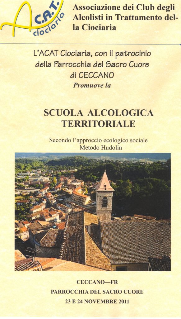 La propone, a chi è interessato, l’Acat, Associazione degli alcolisti in trattamento in Ciociaria, con una scuola alcologica, secondo il metodo Hudolin chiamato così per il nome del professore croato che cominciò ad applicarlo di fronte alla tragedia della gioventù jugoslava all’inizio degli anni ’60. Il metodo, che è quello dei gruppi di alcolisti e che superava l’atteggiamento repressivo e farmacologico, sarà illustrato in due giornate, rispettivamente il 23 e il 24 novembre, in serata, nella parrocchia del Sacro Cuore.