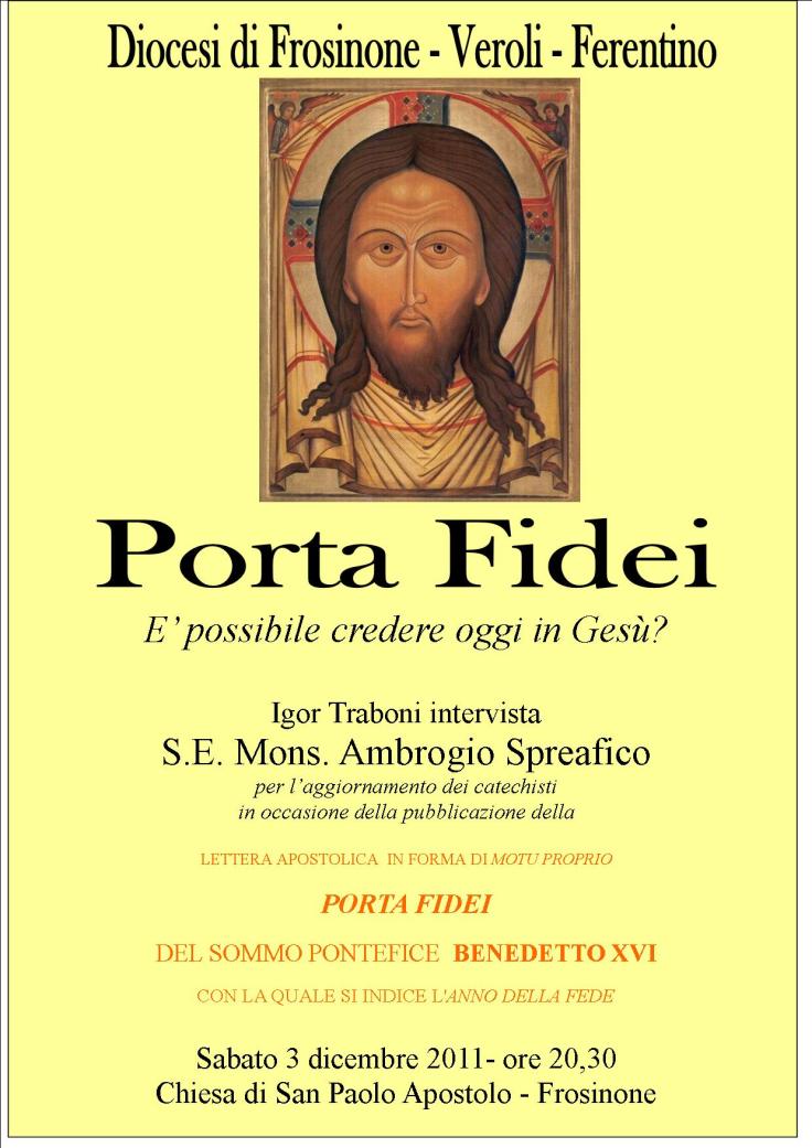 Si può credere oggi? E’ la domanda cui proverà a rispndere sabato 3 dicembre, alle ore 20,30, in S. Paolo a Frosinone, il vescovo, mons. Ambrogio Spreafico. Lo intervisterà Igo Traboni, ponendo le questioni centrali che Benedetto XVI ha esposto nella sua Esortazione Porta Fidei, con la quale ha indetto per il 2012 l’anno della Fede. La domanda di Gesù Il figlio dell’uomo troverà la fede quando tornerà sulla terra? è l’interrogativo centrale della vita dei cristiani. Siamo capaci di credere? Riusciamo ad essere vigilanti nonostante tutte le contraddizioni della nostra vita? Il vescovo Spreafico ha da qualche mese avviato un dialogo con i giovani della sua diocesi, scrivendo loro una lettera e ricevendo tante risposte. Saranno probabilmente queste a guidare la sua riflessione sulla fede. L’intervista di mons. Spreafico si svolge nell’ambito dell’aggiornamento dei catechisti per l’Avvento 2011.