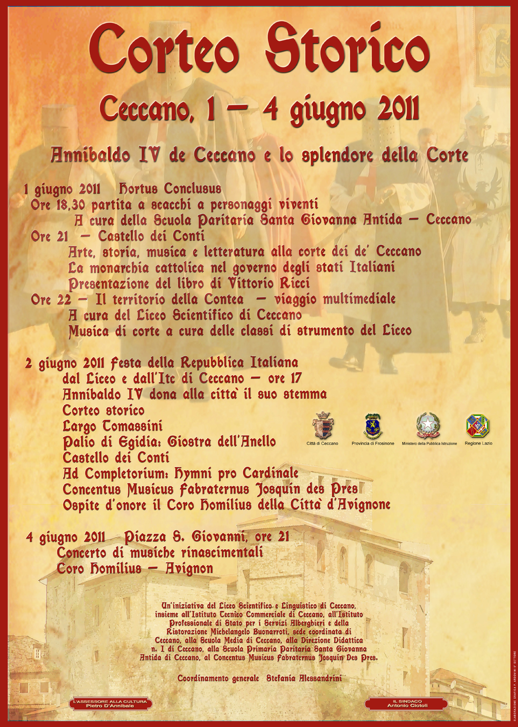 de Fetes della Mairie d’Avignon, vedi avignone-2011-il-liceo-ricevuto-nella-salle-des-fetes ) oltre 400 personaggi in costume di tutte le scuole di Ceccano vivacizzano il corteo, i cui protagonisti rappresentano persone realmente esistenti in quel giugno del 1350, anno del II giubileo, quando Annibaldo IV de Ceccano, cardinale arcivescovo del Tuscolo e di Napoli, segretario di stato di Clemente VI, papa in Avignone, amico di Francesco Petrarca e Simone Martini, legato pontificio al Giubileo, arriva nella sua città natale con tutta la sua corte, per fare dono dello stemma al fratello, Tommaso II, conte di Ceccano.