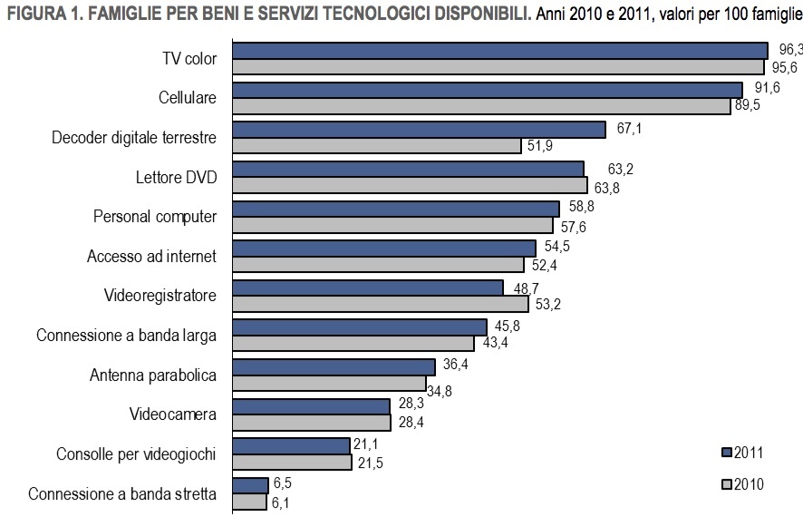 Il 90% delle famiglie con almeno un figlio adolescente ha accesso ad internet. E’ l’impressionante dato che emerge dall’indagine sulla diffusione delle nuove tecnologie nella società italiana, curata dall’Istat, su un campione di 20 mila famiglie. Il report ha come titolo Cittadini e nuove tecnologie ha inteso indagare la portata dell’impatto relativo alle nuove tecnologie nel contesto italiano. Nelle famiglie con minorenni, invece, la percentuale di diffusione delpersonal computer raggiunge l’84,4% (contro l’11,3% delle famiglie di soli anziani), quella dell’accesso a Internet il 78,9% (contro il 9,4% dei capelli bianchi), quella della connessione a banda larga il 68% (contro il 7,6%); il cellulare è addirittura presente in misura maggiore (99,7%) rispetto al televisore (97%) e superano la media nazionale pure i livelli di penetrazione di lettori DVD (86,4%, contro 22,9% delle famiglie over 65), decoder digitali (72,9%, contro 58,3%), videoregistratorI (61,3%, contro 26,1%), videocamere (52,1%, contro 5,5%), consolle per videogiochi (48%, contro 0,4%) e antenna parabolica (46,7%, contro 19,6%).