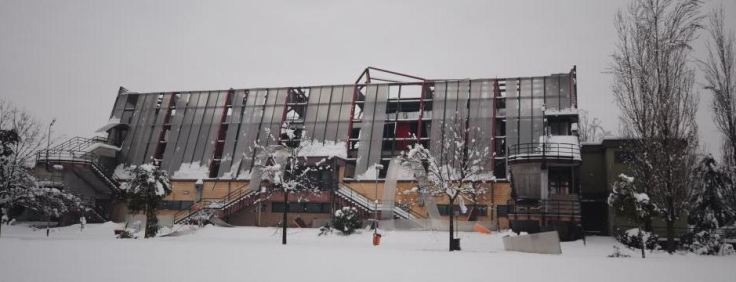 la solita passeggiata domenicale, con neve, ci ha condotto davanti al palazzetto dello sport.Allo shock di vedere un bell’edificio pubblico del tutto rovinato si è aggiunto lo stupore nel costatare che, alle cinque del pomeriggio, ancora nessun amministratore pubblico, nessun tecnico comunale, nessun responsabile dell’impianto si fosse peritato di documentarne il danno, di costatarne l’entità. Immacolata la neve intorno al palzzetto. Chiusi a chiave i cancelli nell’incuria generale…. aspettando la primavera.