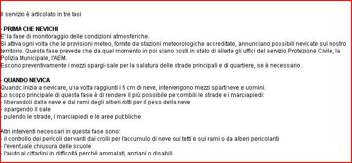 per quanto riguarda il piano di emergenza lo si puo leggere presso l’ufficio tecnico del comune, ma ripeto forse sarebbe opportuno più sapere informazioni relative al comportamento da adottare e cosa fare durante un emergenza no dettagli tecnici di interventi es.( lo spalaneve X deve andare nella zona X – la Polizia Locale deve chiudere la strada X ecc.) cmq le informazioni sui comportamenti si possono trovare sul sito internet: