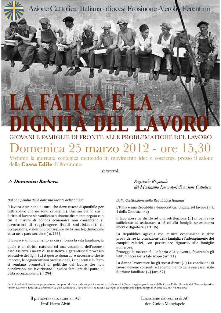 Per questa ragione la Presidenza diocesana dell’azione Cattolica ha organizzato un convegno dibattito per domenica 25 marzo, alle ore 15,30, presso la Cassa edile di Frosinone, in Piazza De Mattheis, per capire meglio quello che accade attorno a noi sul tema del lavoro che non c’è e sul futuro dei nostri figli. Interverrà in dott. Domenico Barbera, incaricato regionale del Movimento lavoratori di Ac. Al convegno sono stati invitati amministratori pubblici e responsabili sindacali e di associazioni di categoria.