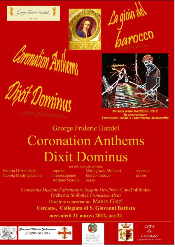 Le possenti e gioiose note dei Coronation Anthems di Haendel, la massima espressione della musica cerimoniale britannica, ricorderanno il 21 marzo 2012 Francesco Alviti, il giovane musicista percussionista, scomparso a 22