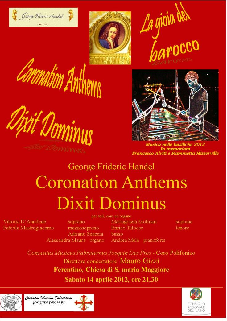 Le possenti e gioiose note dei Coronation Anthems di Haendel, la massima espressione della musica cerimoniale britannica risuoneranno solenni tra le volte della chiesa gotico cistercense di S. Maria maggiore a Ferentino, sabato 14 aprile, con inizio alle ore 21,30 Il concerto, il cui programma prevede anche il Dixit Dominus del compositore germanico, è inserito nell’iniziativa Musica nelle basiliche 2012, dedicato alla memoria dei giovani scomparsi prematuramente