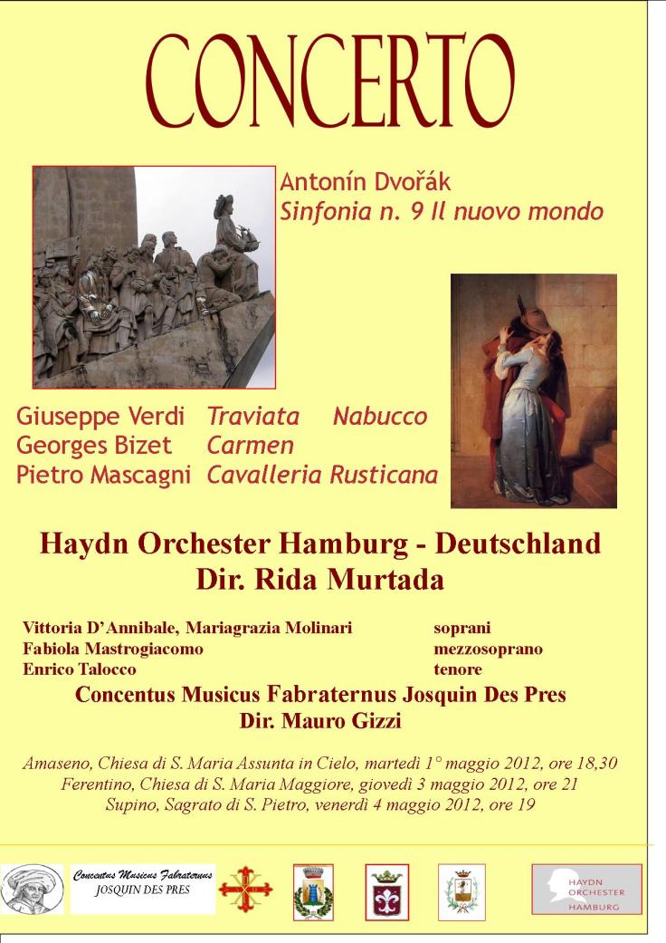 I concerti si svolgeranno ad Amaseno il 1° maggio alle ore 18,30, in S. Maria assunta, a Ferentino il 3 maggio, in S. Maria maggiore alle 21, e a Supino, sul sagrato di S.Pietro, il 4 maggio alle 19, in collaborazione con le civiche amminsitrazioni. L’orchestra Haydn di Amburgo sarà diretta da Rida Murtada, da diversi anni alla guida del prestigioso complesso sinfonico anseatico, mentre il coro Josquin Des Pres da Mauro Gizzi. Le voci soliste saranno quelle di Vittoria D’Annibale e Mariagrazia Molinari, soprani, di Fabiola Mastrogiacomo, mezzosoprano e di Enrico Talocco, tenore. La direzione artistica è di Mauro Gizzi.