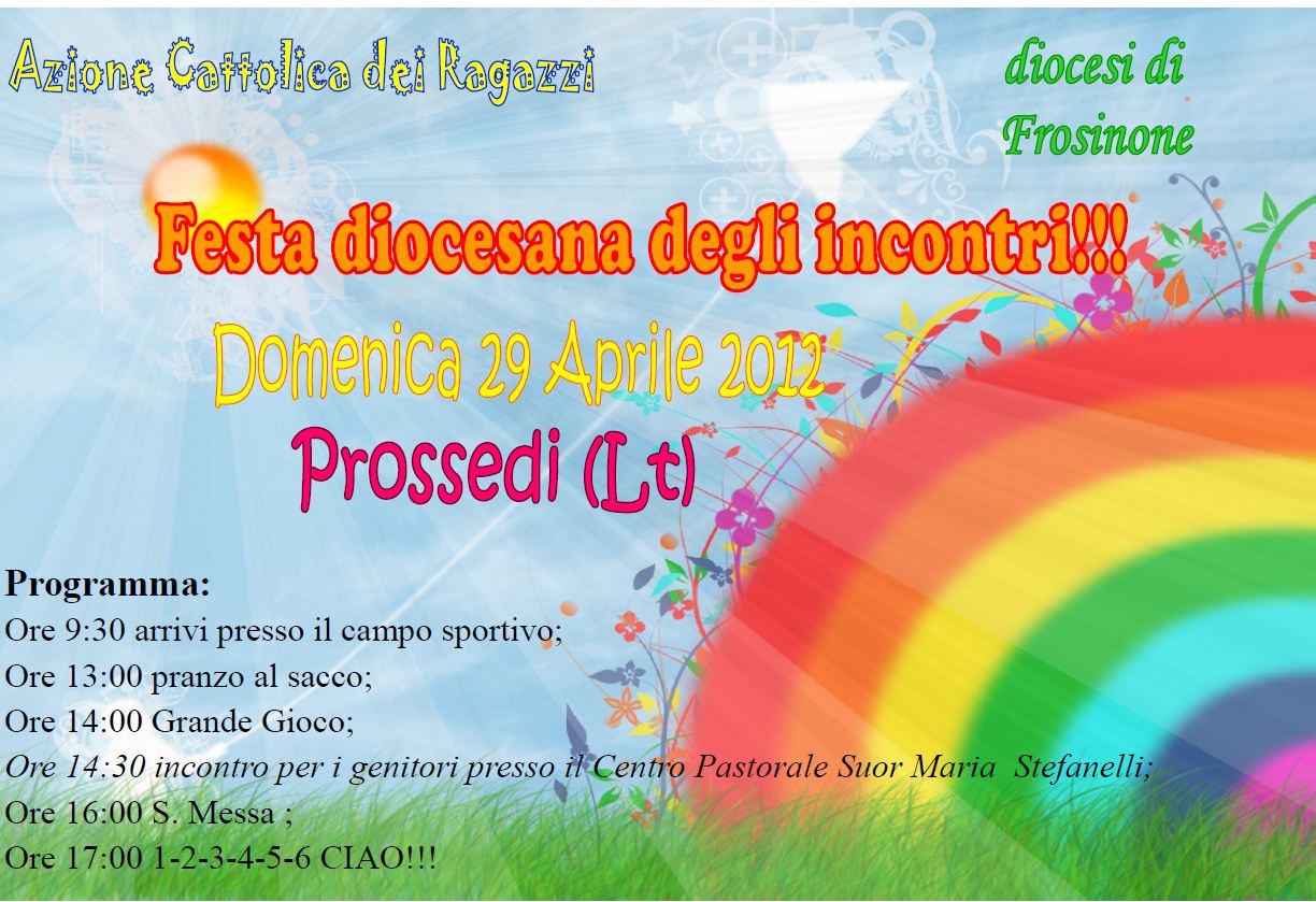 Si terrà a Prossedi, domenica 29 aprile, la Festa diocesana degli Incontri, l’appuntamento annuale che vcede tutti i gruppi dell’Azione Cattolica Ragazzi riunirsi insieme per raccontarsi com’è andato l’anno, quali progetti per l’estate, fare il punto della situazionie divertirsi tanto, tutti insieme, perché insieme è più bello. Alle 9,30 i ragazzi si troveranno nel piazzale di fronte alla Chiesa di S. Agata e saranno coinvolti in una serie di giochi comunitari, ci sarà poi la visita agli stands, che illustrano la storia dei 143 anni di vita dell’Azione Cattolica Italiana, attraverso i suoi personaggi più significativi, a cominciare da Mario Fani e Giovanni Acquaderni che la fondarono nel 1868, con il nome di Società della Gioventù Cattolica. I ragazzi, gli adolescenti e i giovani dell’Ac vogliono essere vivaci e felici, generosi e coraggiosi, come il beato Pier Giorgio Frassati. Vogliono avere slancio di dedizione alla costruzione della città di tutti e coraggio di servizio nelle istituzioni, come Vittorio Bachelet, vicepresidente del Consiglio Superione della Magistratura ed ucciso dalle BR, come il beato Alberto Marvelli, giovani consigliere comunale a Rimini, come Giuseppe Toniolo, teorico della dottrina sociale della Chiesa, che presto sarà proclamato beato.Vogliono essere amici fedeli di Cristo, come le beate Pierina Morosini e Antonia Mesina, come la venerabile Armida Barelli. Vogliono ravvivare le nostre comunità da bambini affascinanti per la purezza del loro cuore, come Antonietta Meo, capaci di attirare anche i genitori a Gesù. E proprio per i genitori ci sarà un incontro, dopo il pranzo. Nel manifesto della giornata c’è un invito: ti aspetta una giornata di estremo divertimento, prepara lo zaino, porta con te la tua allegria e vieni con noi, perché insieme è più bello.