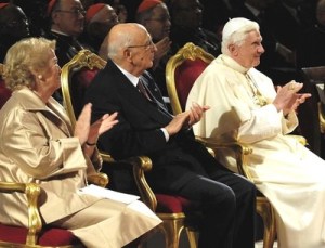 Ecco il comunicato stampa: Il Senatore Giorgio Napolitano, Presidente della Repubblica Italiana, è stato ospite ieri del Santo Padre Benedetto XVI nella Residenza estiva di Castel Gandolfo. Poco prima delle diciotto, accompagnato dalla Consorte, Clio Maria Bittoni, il Presidente Napolitano è stato accolto da Benedetto XVI nel Giardino del Moro. Dopo un breve colloquio al Torrione, il Pontefice ed il Presidente hanno raggiunto il Cortile interno del Palazzo Apostolico per assistere al concerto della Orchestra “West-Eastern Divan”, diretta dal Maestro Daniel Barenboim. Infine il Presidente della Repubblica e la Consorte sono stati ospiti del Santo Padre per la cena.