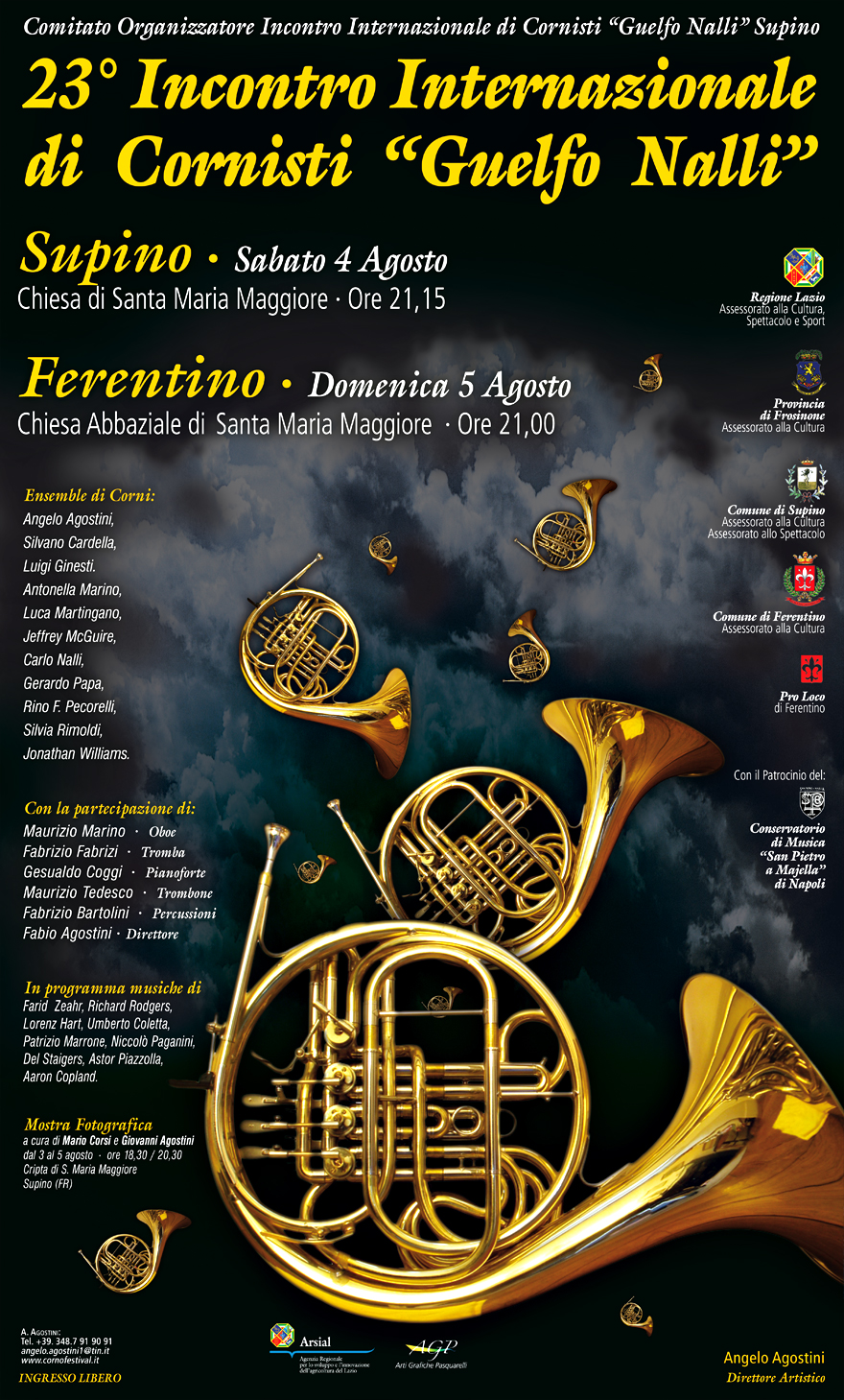 I migliori cornisti del mondo in concerto, per ricordare Guelfo Nalli, uno dei grandi musicisti di Supino, cui è dedicato il XXIII incontro internazionale dei cornisti. Sabato 4 a S. Maria in Supino e domenica 5 nella chiesa abaziale di S. maria Maggiore in Ferentino artisti provenienti da tutto il mondo ricorderanno Guelfo: l’incontro è organizzato da un altro grande cornista, Angelo Agostini, che insegna al Conservatorio di Musica “San Pietro a Majella di Napoli”.