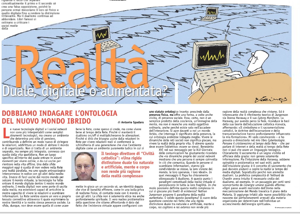Finché si dirà che bisogna uscire dalla relazioni in Rete per vivere relazioni reali si confermerà la schizofrenia di una generazione che vive l’ambiente digitale come un ambiente puramente ludico in cui si mette in gioco un secondo sé, un’identità doppia che vive di banalità effimere, come in una bolla priva di realismo fisico, di contatto reale con il mondo e con gli altri. La sfida non è solamente etica ma anche profondamente spirituale.Il vero nucleo problematico della questione che stiamo affrontando è dato dal fatto che l’esistenza virtuale appare configurarsi con uno statuto ontologico incerto: prescinde dalla presenza fisica, ma offre una forma, a volte anche vivida, di presenza sociale.