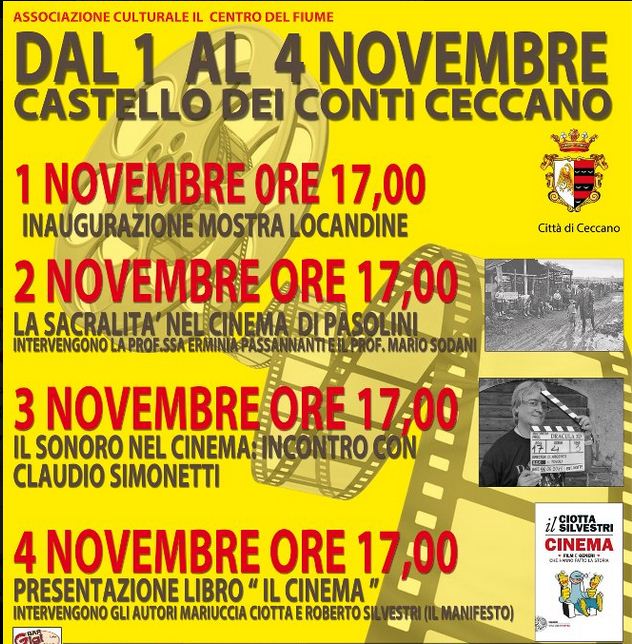 Una mostra di locandine, una giornata dedicata al cinema “sacro” di Pierpaolo Pasolini, un’altra alle colonne sonore con Claudio Simonetti, l’autore delle musiche dei film di Dario Argento, e infine la presentazione del libro Il cinema di Mariuccia Ciotta e Roberto Silvestri. E tutto nel magnifico Castello dei Conti di Ceccano