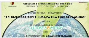 Manca meno di un mese alla fine del mondo, almeno a stare a quanto dicono alcuni interpreti del calendario maya. Per capire qualcosa in più l”Associazione culturale “Cultores Artium” con il patrocinio del Comune di Ceccano organizza per il 21 novembre 2012 alle ore 16:30 nelle sale del Castello dei conti de Ceccano un’interessante conferenza / dibattito sull’enigmatico tema della “Fine del mondo” secondo il calendario Maya.