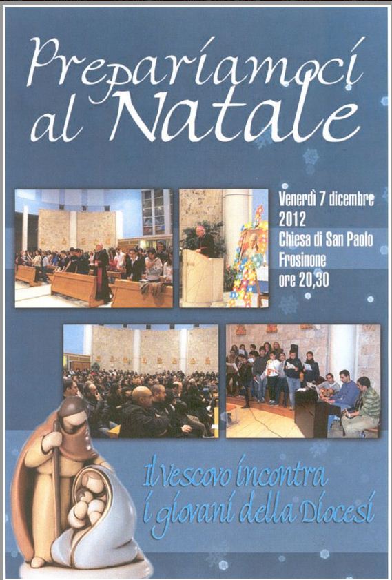 Stasera, venerdì 7 dicembre, vigilia dell’Immacolata Concezione, alle 20, 30, nella chiesa di S. Paolo a Frosinone, il vescovo di Frosinone, mons. Ambrogio Spreafico, incontrerà i giovani in uno dei tradizionali e partecipati incontri serali. Il tema di stasera è quello della preparazione al Natale. L’invito a partecipare è per tutti.