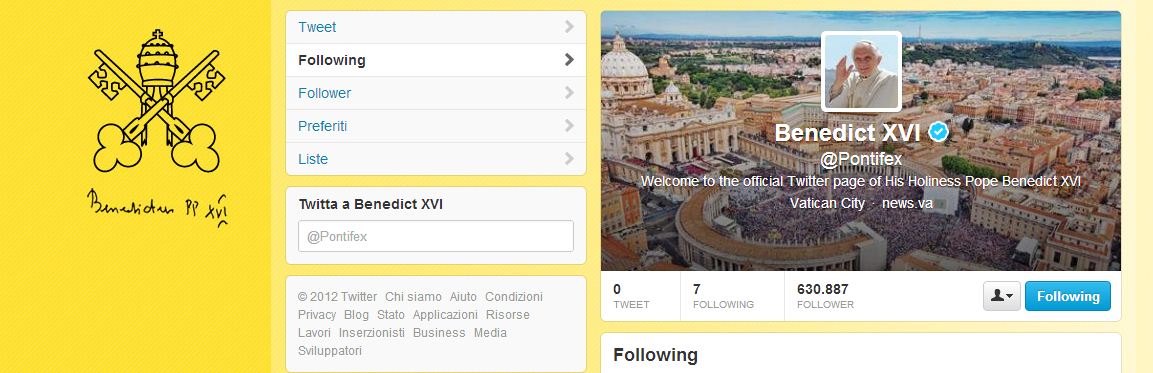 Cresce l’attesa per il primo tweet di Benedetto XVI, previsto per il 12 dicembre dall’account @pontifex, e p. Antonio Spadaro sul suo blog http://www.cyberteologia.it ci fa sapere che ci sono ben altri 8 cardinali che da anni e da mesi frequentano l’ambiente digitale. Oltre a Gianfranco Ravasi, presidente del Consiglio per la cultura, ci sono anche l’arcivescovo di S. Paolo del Brasile, Odilo Scherer, il card. Scola, arcivescovo a Milano, quello di Boston, card. Sean, l’arcivescovo di Durban, in Australia, Napier, e anche quello di New York, card. Dolan, di Barcellona, card. Sistach, e il cardinale colombiano Ruben Gomez, arcivescovo di Bogotà. Qui l’elenco completo con tutti gli indirizzi