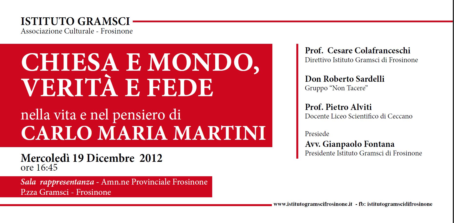 Un’iniziativa dell’Istituto Gramsci per ricordare il card. Carlo Maria Martini, recentemente scomparso. Un incontro dibattito si svolgerà mercoledì 19 dicembre, alle ore 16,45, nel salone di rappresentanza dell’Amministrazione Provinciale di Frosinone. Il cardinale Martini, si legge nelle parole che accompagnano l’invito del’Istituto, è stato un brillante studioso e interprete della Bibbia, capace però anche di guidare la più grande diocesi del mondo, Milano, nei difficili “anni di piombo” del terrorismo, facendone oggetto di studi dei complessi problemi della modernità industriale. Aperto all’ascolto di tutte le componenti culturali della contemporaneità, ha istituzionalizzato il colloquio con i non credenti attraverso una “cattedra” nella sua diocesi destinata a rispondere a reali esigenze e conoscere largo seguito. Attento ai progressi ed alla centralità culturale della scienza e delle sue applicazioni, ha saputo individuare le zone in cui ogni “verità assoluta” è incapace di calarsi ed è necessario “dare a ciascuno una voce”.