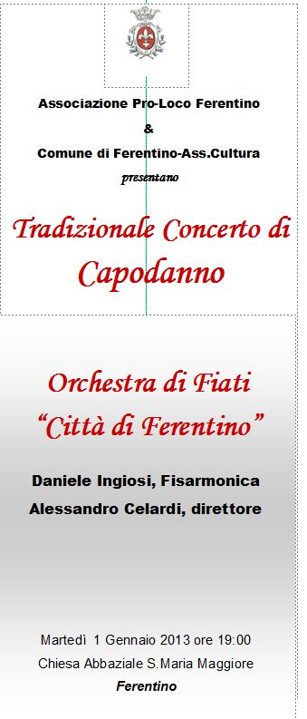 Le bellissime forme architettoniche di S. Maria Maggiore a Ferentino ospiteranno, il 1° gennaio 2013, alle ore 19 il tradizionale Concerto di Capodanno che vedrà l’Orchestra di fiati di Ferentino diretta da Alessandro Celardi presentare brani di Piazzolla, Strauss, Sparke e Morricone. Nei brani di Piazzolla suonerà anche il fisarmonicista Daniele Ingioia. Un appuntamento da non perdere soprattutto se si tiene conto che l’Orchestra di Fiati Città di Ferentino è una delle realtà musicali più significative del Lazio meridionale.
