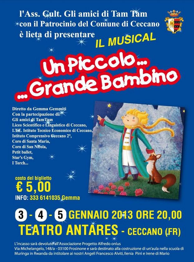 Liberamente ispirato al Piccolo Principe, Un piccolo grande bambino è lo spettacolo di beneficenza che andrà in scena all’Antares di Ceccano dal 3 al 5 gennaio e servirà a raccogliere fondi per costruire un’aula nella www.scuoladialfredo.it in Rwanda che sarà intitolata a FRANCESCO ALVITI, ILENIA PIRRI ED IRENE DI MARIO. Al musical diretto da Gemma Gemmiti hanno aderito l’ Ass.cult. gli amici di tam tam con Gemma Gemmiti, Filippo Giovannone e Antonio Segneri; il Liceo Scientifico e Linguistico di Ceccano e l’Istituto Tecnico Economico con Vittoria D’Annibale; le scuole Petit Ballet di Giuditta Bianchini e Star’s Gym Alessia Ciammella; l’Istituto Comprensivo Ceccano 2 con Valeria Filippo; i cori di S. Maria e S. Nicola con Chiara Olmetti. tante persone, tanti artiusti, soprattutto tanti giovani messi insiemne dalla voglia di essere solidali con chi è più sfortunato di loro, nel ricordo di giovani che hanno avuto sogni e progetti, infranti dalla durezza della vita, e che però oggi riverberano in chi non li dimentica.