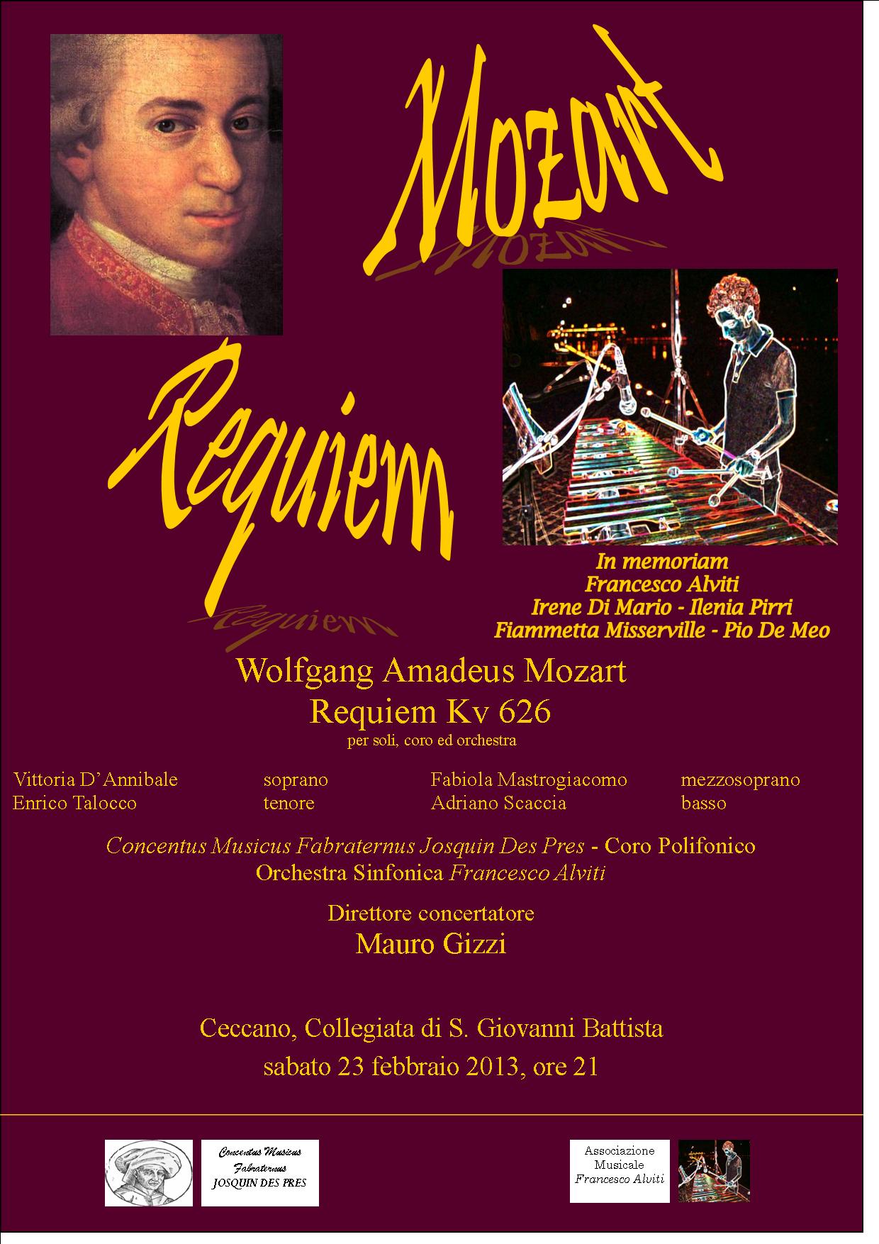 Il Requiem di Mozart per ricordare giovani vite, troncate da mali contro cui hanno lottato vanamente: il grande compositore salisburghese compose il Requiem mentre stava per morire, tanto da lasciarlo incompiuto. La sua è dunque una meditazione sul mistero della propria vita e sulla lotta tra la morte e Gesù che la vince, risorgendo. Le note struggenti e piene di speranza del Requiem risuoneranno sabato 23 febbraio, giorno del IV anniversario della scomparsa di Francesco Alviti, giovane percussionista, morto dopo aver combattuto con coraggio contro la sua malattia.