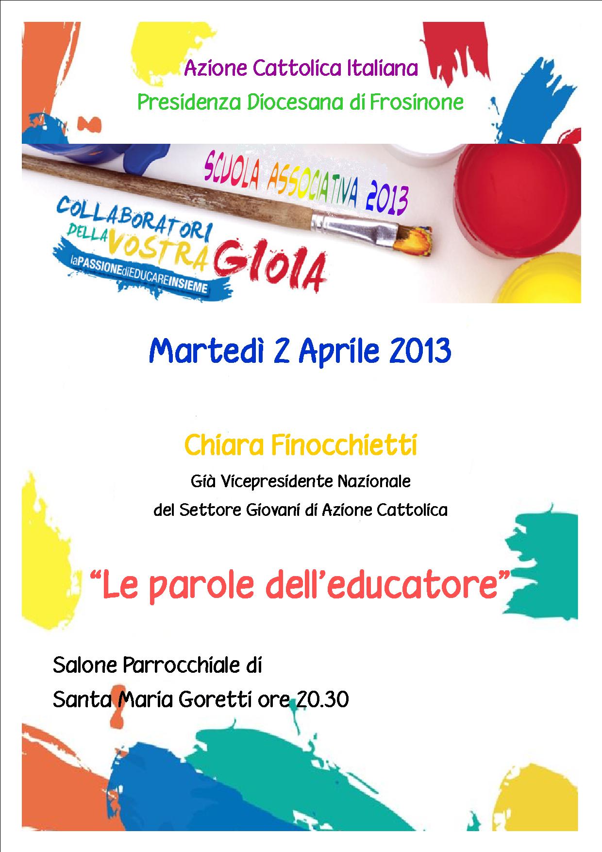 Le parole dell’educatore sono al centro della reiflessione che Chiara Finocchetti, già vicepresidente nazionale dei giovani di Azione Cattolica, proporrà martedì 2 aprile, alle ore 20, 30 nella parrocchia di S. Maria Goretti per la scuola associativa che l’AC della diocesi di Frosinone dedica a tutti coloro che hanno cura dei ragazzi. La cura delle persone è elemento essenziale della spiritualità cristiana, che esprime proprio nella custodia dell’altro uno dei suoi pilastri fondamentali. L’educazione è l’espressione di questa cura e di questa custodia.