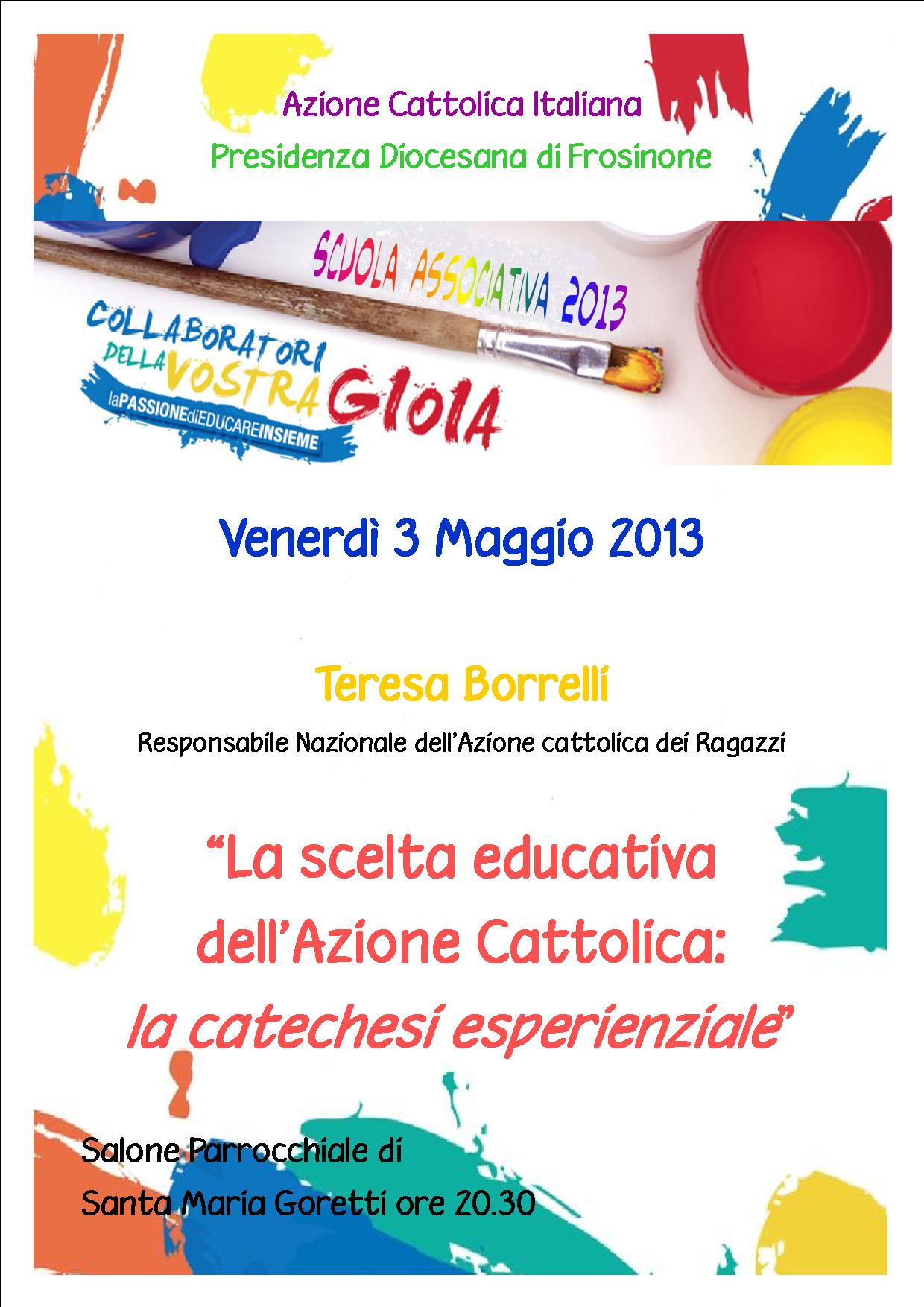 La catechesi esperienziale per rinnovare il catechismo. E’ la proposta che l’Azione Cattolica fa a tutte le parrocchie per cambiare la catechesi ed ottenere risultati migliori: è la proposta che da tempo si concretizza nell’attività dell’Acr, l’esperienza che coinvolge decine di migliaia di bambini e di ragazzi, dai 6 ai 14 anni in Italia. Non vanno più al catechismo per i sacramenti ma frequentano la parrocchia per una esperienza di fede che dura per tutta la loro vita. Se ne parlerà venerdì 3 maggio, alle ore 20,30, a Frosinone, nella parrocchia di S. Maria Goretti, con l’atteso intervento di Teresa Borrelli, responsabile nazionale dell’Azione Cattolica dei ragazzi.