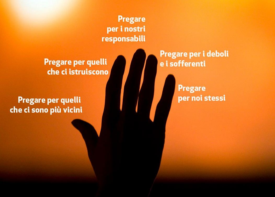 1) Il pollice è il dito più vicino a te. Così inizia a pregare per chi ti è più vicino. Sono le persone che più facilmente tornano nei nostri ricordi. Pregare per le persone a noi care è “un dolce obbligo”.