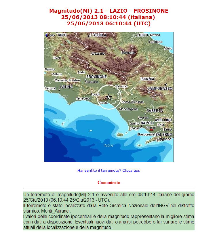 Terremoto stamane sui Monti Aurunci: epicentro tra Minturno ed Ausonia, magnitudo 2.1