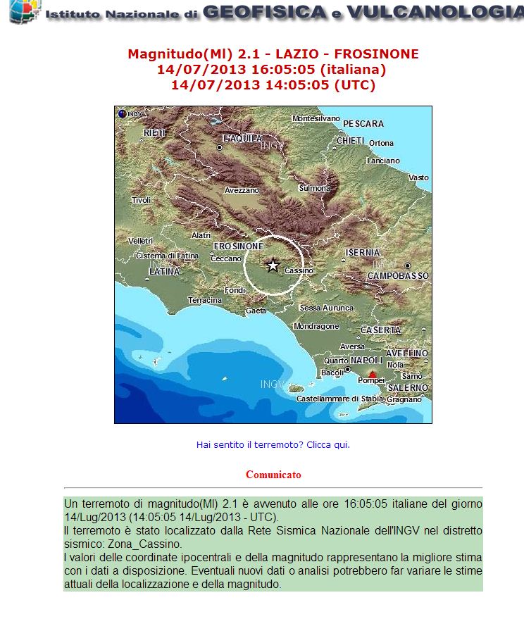 Altra scossa di terremoto nel cassinate, con epicentro Castrocielo e Colle S. Magno, di magnitudo 2.1: è stata registrata poco dopo le 16 di domenica 14 luglio.