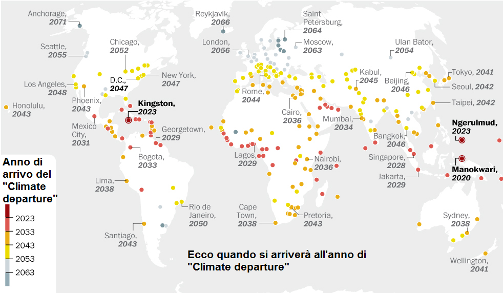 Roma, anno 2044. Nulla è più come prima. Nella città si è raggiunto il “Climate departure”, difficile da tradurre in italiano con due parole con il vero significato inglese. Tra gli scienziati che studiano il clima del nostro pianeta, la frase “clima della partenza” sta ad indicare il momento in cui letemperature medie, sia in una posizione specifica del pianeta o in tutto il mondo, diventano cosìdiverse rispetto alle temperature dei decenni precedenti che tutto ciò che riguarda il vecchio clima di quella regione è lasciato alle spalle. Si entra ciò in una nuova faseclimatica. E ‘una sorta di punto di non ritorno. Si può immaginare che dal momento in cui una città o una regione è interessata dal “Climate departure”, si ha che la temperatura media del suo anno più freddo da quel momento è più caldo dell’anno più caldo misurato dal 1960 al 2005. Per Roma e per l’Italia sarà il 2044 se non si interverrà nel diminuire l’anidride carbonica del Pianeta. Il dato lo si scopre analizzando la cartina in basso (clicca per ingrandirla) risultato di uno studio appena pubblicato su Nature che dice che la Terra, nel suo complesso raggiungerà il Climate departure nel 2047. Tuttavia le diverse regioni del pianeta potranno raggiungere quel “momento” in tempi diversi. Le aree caraibiche, ad esempio lo toccheranno già a partire dal 2023. Nulla da fare? In realtà lo studio afferma che si può ancora agire e spostare più in là quel momento. Agire significa intraprendere tutto quello che è possibile per ridurre le emissioni di gas serra: dall’uso di energia pulita allo stoccaggio dell’anidride carbonica.