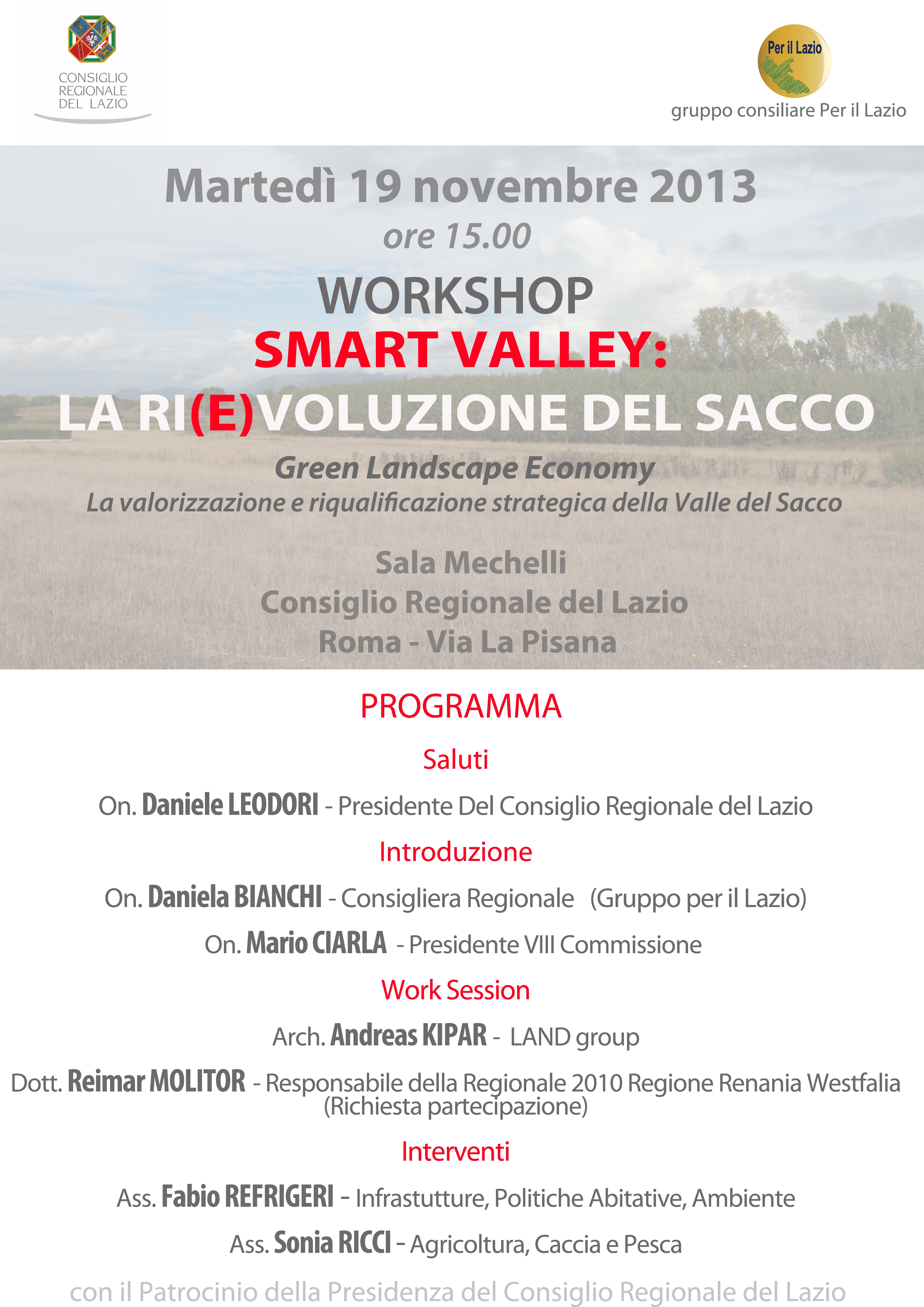 Progettare una terra nuova, nella quale agricoltura, industria e cultura possano convivere e svilupparsi, contribuendo ed essere parte del risanamento ambientale. Questa l’idea centrale dello Smart Valley, il workshop sulla Valle del Sacco promosso dalla consigliera Daniela Bianchi del gruppo “Per il Lazio” che si svolgerà domani alle ore 15 nella sede del consiglio Regionale (sala Mechelli) e che chiamerà a raccolta tutti gli attori coinvolti nella bonifica della Valle del Sacco. L’evento è stato organizzato nell’ambito del Tavolo Regionale, istituito dall’VIII commissione per dare una cabina di regia al recupero di un’area vastissima, duramente colpita dall’inquinamento industriale.