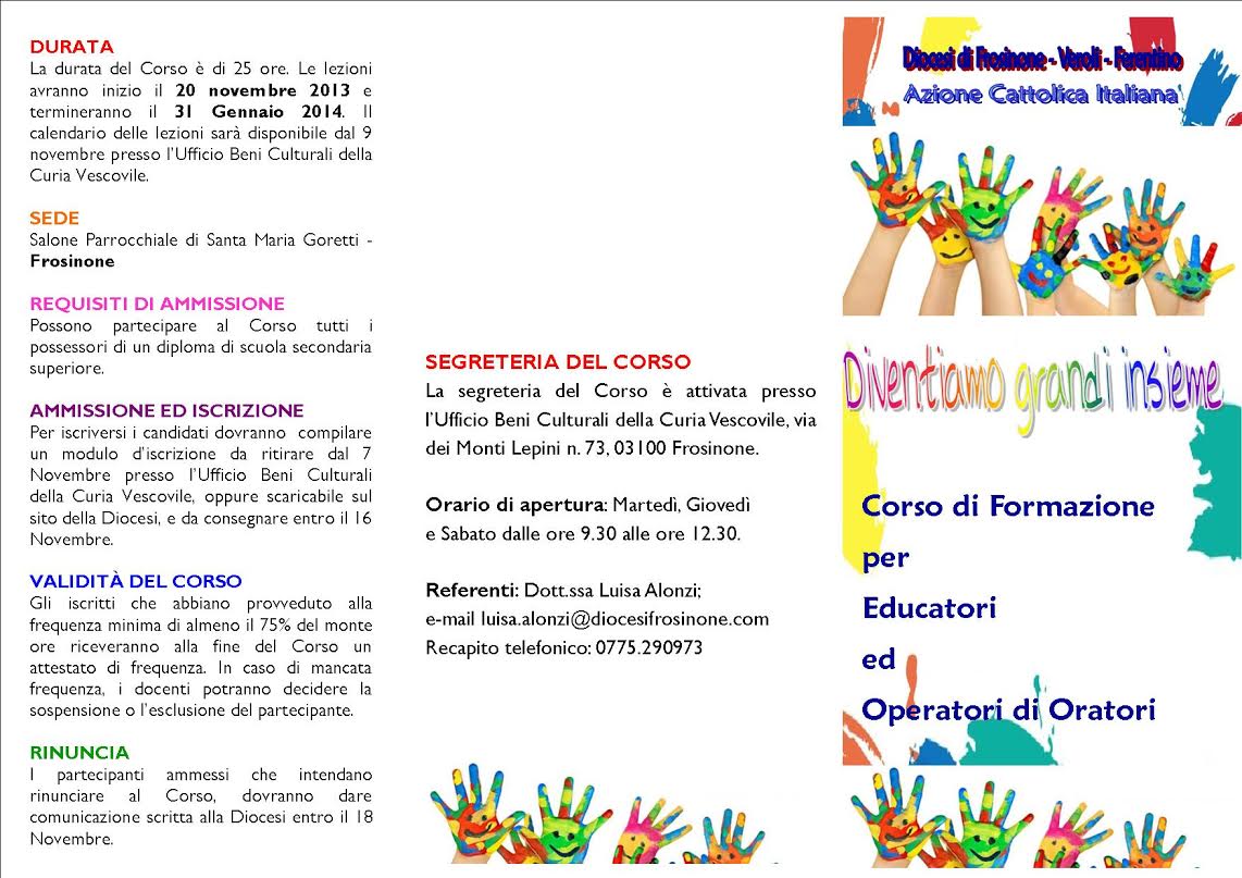 Qui il programma del Corso dell’azione Cattolica Italiana che avrà inizio questa sera, mercoledì 20 novembre, alle ore 20,30 presso la parrocchia di S. Maria Goretti a Frosinone