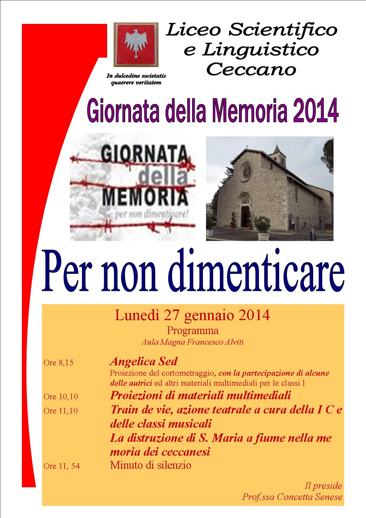 Angelica Sed, un film cortometraggio realizzato dagli allievi sulle leggi razziali aprirà la giornata della Memoria 2014 al Liceo di Ceccano, lunedì 27 gennaio 2014, anniversario dell’entrata delle truppe sovietiche nel lager di Auschwitz. Il cortometraggio è la riproposizione della storia di Angelica Sed, bambina romana, cacciata dalle scuole della capitale per le leggi razziali e poi morta nel campo di sterminio di Auschwitz. Nell’Aula Magna Francesco Alviti, per tutto la mattinata, ci sarà un susseguirsi di proiezioni e dibattiti in maniera particolare sugli artisti, i letterati, i poeti, i musicisti scomparsi per la Shoah. Ci sarà anche un’azione teatrale liberamente ispirata al film Train de vie e messa in scena dalle classi musicali del Liceo. Alla memoria della Shoah il Liceo, come tradizione, lega anche quella della distruzione del Santuario di S. Maria a fiume, avvenuta il 26 gennaio del 1944. In un comunicato diffuso agli alunni e ai docenti, la preside Senese scrive: Tutti sono chiamati ad inchinarsi profondamente, nell’intimo, davanti alla innumerevole schiera di coloro che hanno sofferto e sono stati messi a morte per un meschino desiderio di potenza; ci viene dunque chiesto un atteggiamento di silenzio ma anche di attiva partecipazione. La Giornata della Memoria non ha come compito quello della commiserazione delle vittime, non chiede un atteggiamento compassionevole: la Shoah è un’enorme questione politica e antropologica. Politica, perché pone il problema di come un popolo civilizzato abbia scientemente deciso di eliminarne un altro. Antropologica, perché rappresenta una cesura, una rottura nella civiltà occidentale. Il passato, infatti, non è mai soltanto passato. Esso riguarda noi e ci indica quali vie percorrere e quali evitare. Per i Ceccanesi in modo particolare la data assume un ulteriore significato, in quanto proprio il 26 gennaio del 1944, al mattino, la Chiesa di S. Maria a fiume, monumento nazionale e santuario caro alle tradizioni più antiche, fu distrutta da un bombardamento aereo. Le rovine del santuario sono rimaste impresse nella memoria viva degli abitanti di questa città come monito a che non si ripetano più stragi di questo genere.