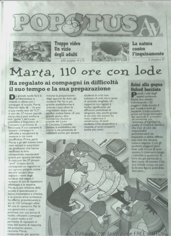 Popotus, il diffuso giornale per ragazzi, pubblicato due volte a settimana, ha dedicato la prima pagina di martedì 28 gennaio al Liceo di Ceccano, a Marta Palombi e ai tutores, il gruppo di 40 allievi disposti ad aiutare i loro compagni con difficoltà nello studio.