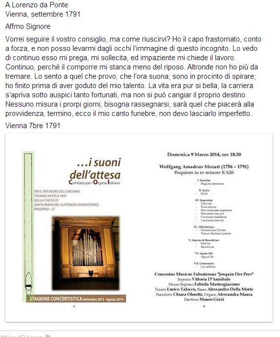 L’ultima lettera di Mozart a Lorenzo Da Ponte, il suo librettista